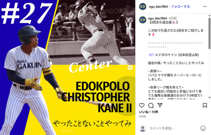 2枚目/7枚中 巨人が狙う「ポスト岡本和真」は誰か…ドラフト候補に急浮上「人気総合格闘家」の兄を持つ「身長189センチ」の規格外スラッガー 野球2025年10月23日 大阪学院大学のエドポロ・ケイン選手(大阪学院大硬式野球部の公式Instagramより) 0