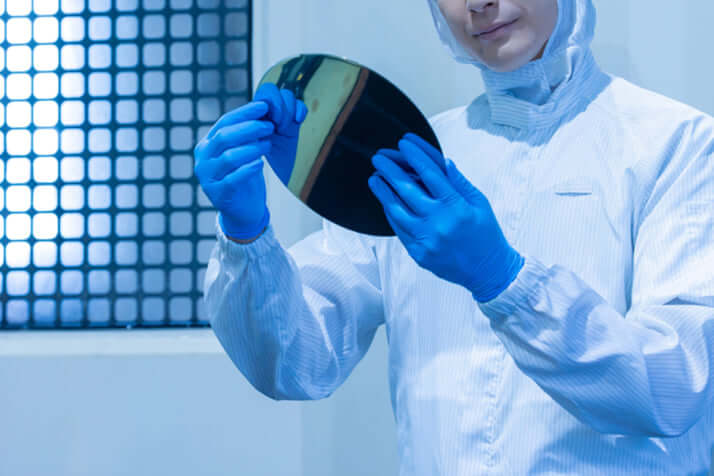 現在、半導体の生産プロセスで重要な役割を果たしているのは、「日本、アメリカ、台湾、韓国、オランダ」で、日本は重要な役割を果たすトップ5カ国の中に入っている。写真は「シリコンウェハー」を持つ男性