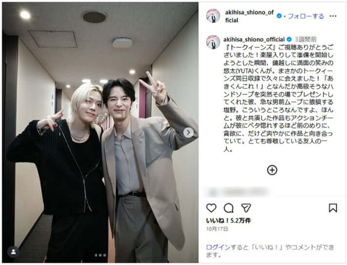 4枚目/14枚中 「スーパー戦隊」50年の歴史に幕――残念なのは子どもより“お母さん”? イケメン俳優の登竜門で“記憶に残る5人”は 芸能2025年11月09日 中本悠太とツーショットのポストは5.2万いいね!がついた塩野のインスタグラム 0