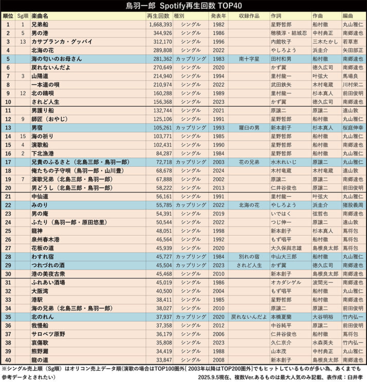 1枚目/8枚中 鳥羽一郎、一番人気のデビュー曲「兄弟船」は「周囲から全く推されていなかった」 発売後も半年“鳴かず飛ばず”だった作品が『紅白』7回歌唱の快挙を遂げるまで 芸能2025年11月11日 鳥羽一郎 Spotify再生回数 TOP40 0