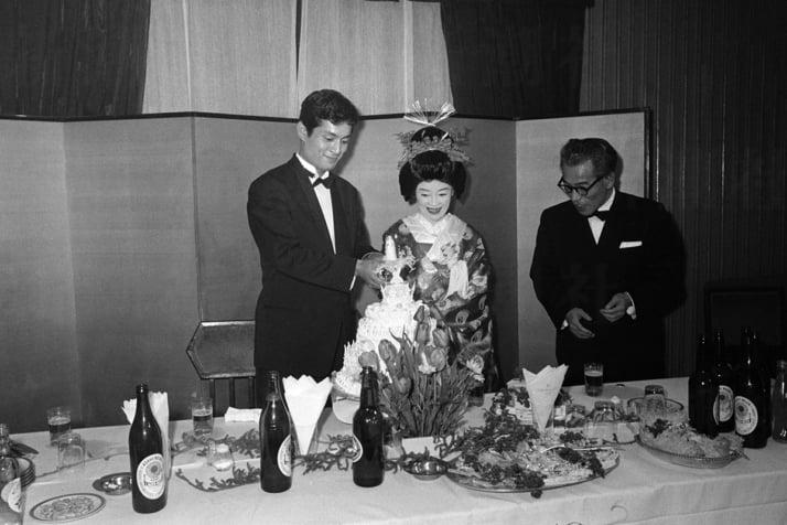 宮崎恭子さんとの結婚式。仲人は東野英治郎氏だった
