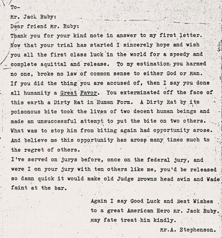 獄中のジャック・ルビーへ届いた感謝の手紙(出典:The portal to Texas Hisrory:)