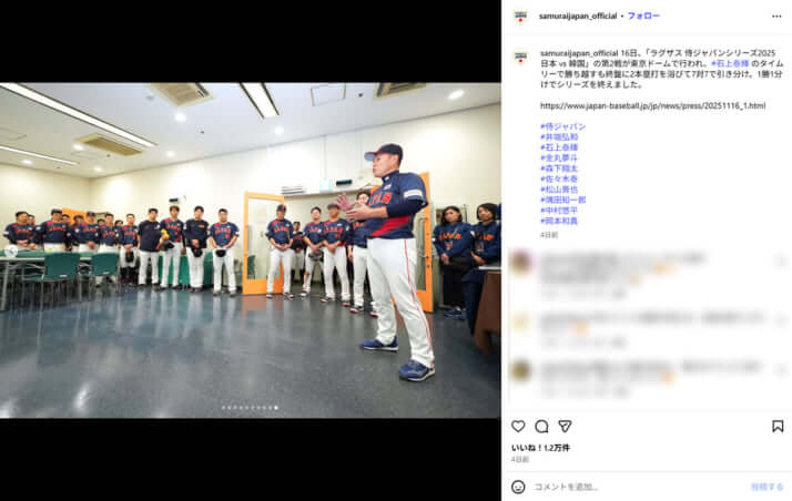 3枚目/6枚中 「打者の小粒感が否めなかった」 侍ジャパン「国内組」にメジャースカウトが辛辣評価 投手も低調 WBC連覇は「大谷翔平が出場しないと…」 野球2025年11月23日 日韓戦2戦目の前、選手に激を飛ばす井端弘和監督(侍ジャパンのInstagramより) 0