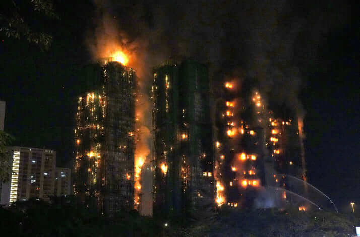 2枚目/5枚中 【香港・高層団地火災】被害拡大の要因は“防護ネット”と“発泡スチロール”か 住人たちを悩ませていた「大規模修繕工事のトラブル」とは 国際2025年11月28日 夜になっても炎の勢いは衰えなかった 0