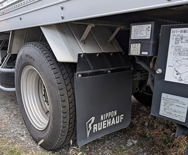 3枚目/4枚中 タイヤの重量は一般車両の5倍…“日本の物流”を支える「トラック整備士」が苦労するのは「体力の消耗」でも「専門知識」でもなく“ドライバーによる改造” 仕事術2026年01月26日 黒い泥除けゴムが装着されている三角の笠のようなものが「フェンダー」(ドライバー提供) 0
