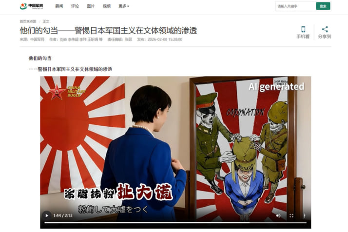 5枚目/12枚中 「高市首相」が旧日本軍兵士の亡霊と手をつなぎ…自民圧勝で中国「人民解放軍」が流した「生成AI動画」の中身 総理は「羊の皮をかぶった狼」 批判の矛先は「卓球・張本」「サッカー・三苫」へも 中国2026年02月14日 動画に登場した高市総理と思われるAI画像(「解放軍報」HPより) 0