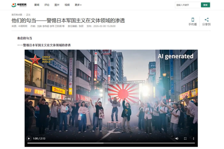 8枚目/12枚中 「高市首相」が旧日本軍兵士の亡霊と手をつなぎ…自民圧勝で中国「人民解放軍」が流した「生成AI動画」の中身 総理は「羊の皮をかぶった狼」 批判の矛先は「卓球・張本」「サッカー・三苫」へも 中国2026年02月14日 動画画像(「解放軍報」HPより) 0
