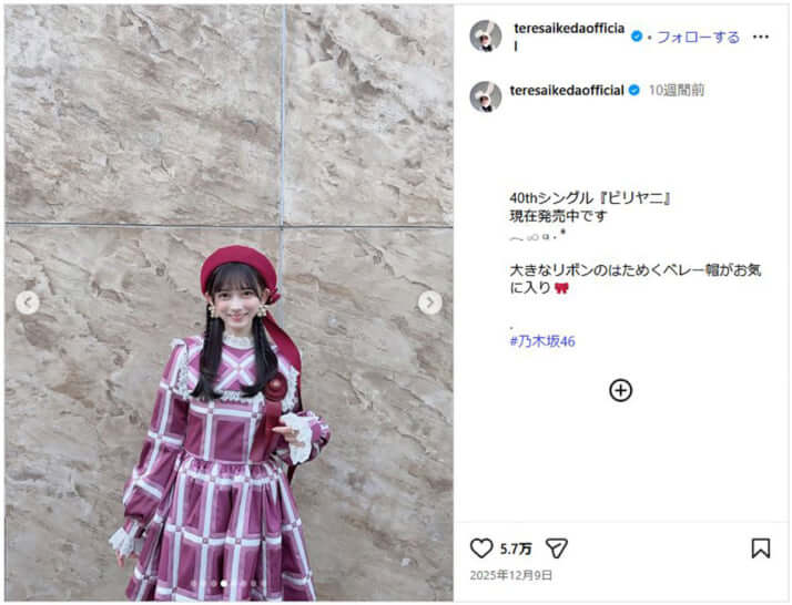 5枚目/5枚中 2浪の末「東京藝大合格」…乃木坂46新センターの「異端すぎる」経歴 坂道シリーズ最高レベル「7987倍」を勝ち抜いた23歳 芸能2026年02月24日 池田瑛紗のInstagramより 0